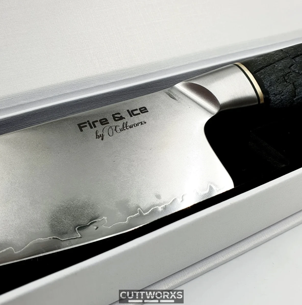 Geboren in het vuur! Cuttworxs Flamewood Fire and Ice koksmes, vervaardigd van hoogwaardig VGmax damast staal.