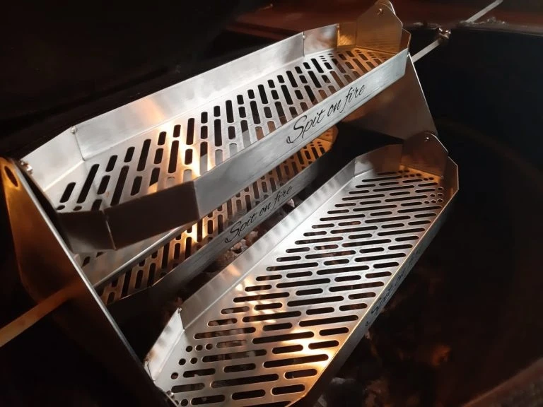 De Carrousel is gemaakt van RVS en heeft 3 plateau’s en past op kamado/ bbq’s vanaf 21 inch of groter. De plateua’s / mandjes draaien mee met de roterende beweging van de rotisserie. Hij is erg makkelijk te montoren op de rotisserie, je schuift het over de spit en schroeft hem vast met 2 vlinderschroeven.