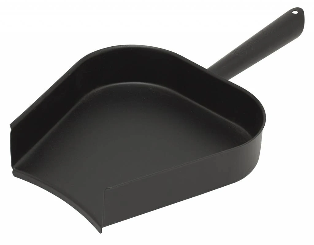 Zwarte metalen schep. Te gebruiken in combinatie met een Bastard as pook. De schep sluit, door zijn ronde vorm, perfect aan op de schuif onderaan uw Bastard, waar u ook het as uithaalt.