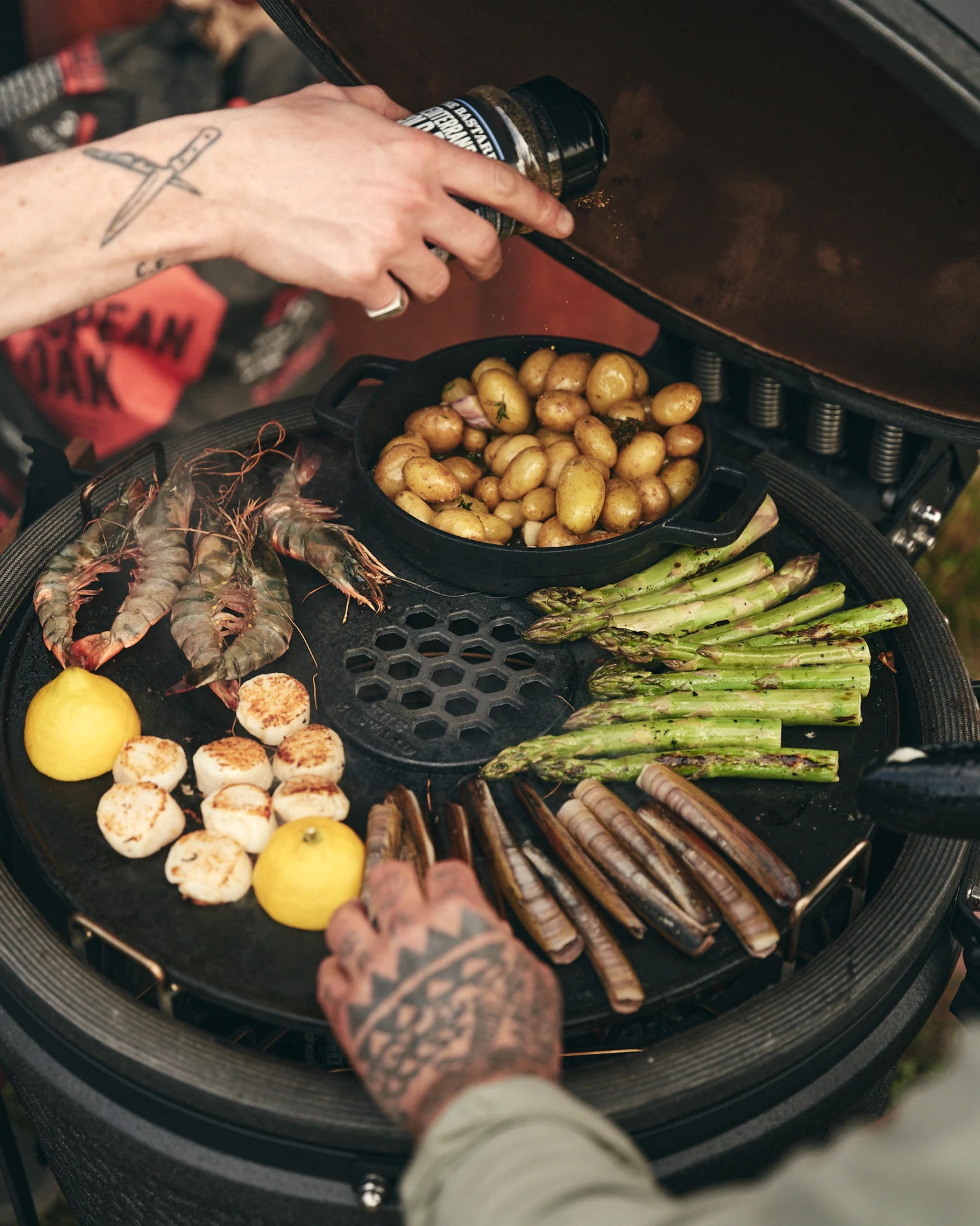 Bastard Phantom Plancha is een op maat gemaakte, zware gladde gietijzeren bakplaat die perfect in je Bastard Compact, Medium of Large past. Deze top Plancha biedt veelzijdige mogelijkheden voor het bereiden van heerlijke BBQ-gerechten, zoals vis, garnalen, smashed hamburgers, groenten en gegrild fruit, zoals gegrilde ananas.